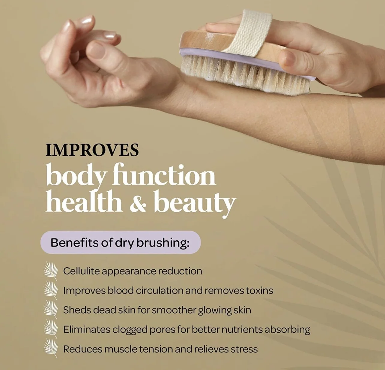 The cellular stimulation from dry brushing facilitates oxygenation of the skin cells, which can visibly invigorate and brighten the complexion. By naturally exfoliating the dead skin cells (along with the dirt and grease from the enviroment) that accumulate even with daily washing, cell turnover is stimulated, resulting in fresh and radiant skin.